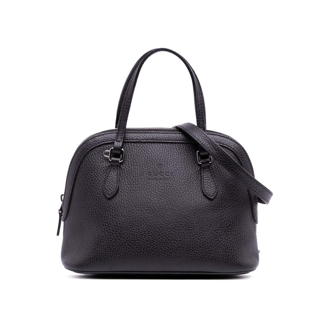 This satchel features a leather body, flat leather handles, a detachable flat leather strap, a top zip closure, and an interior slip pocket.