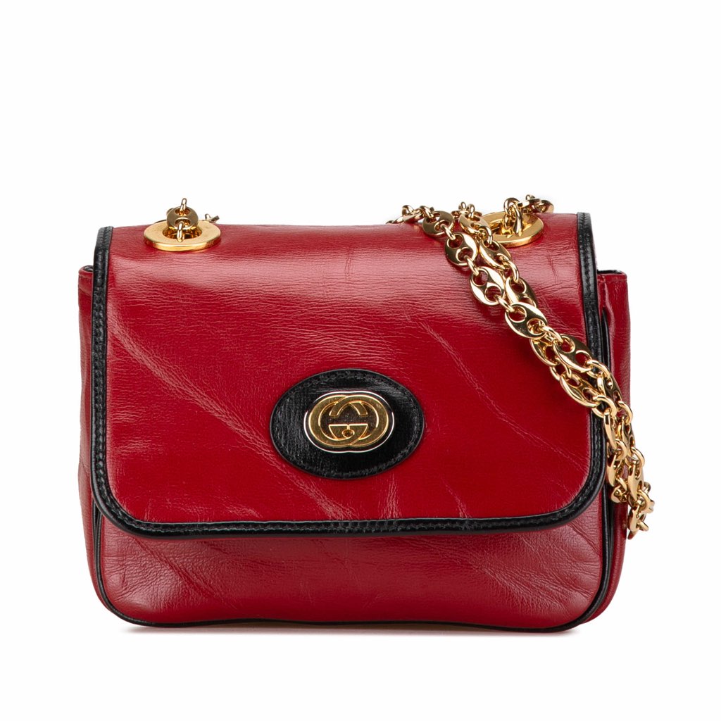 The Marina features a leather body, a gold-tone chain strap, a top flap with magnetic snap closure, and an interior slip pocket.
