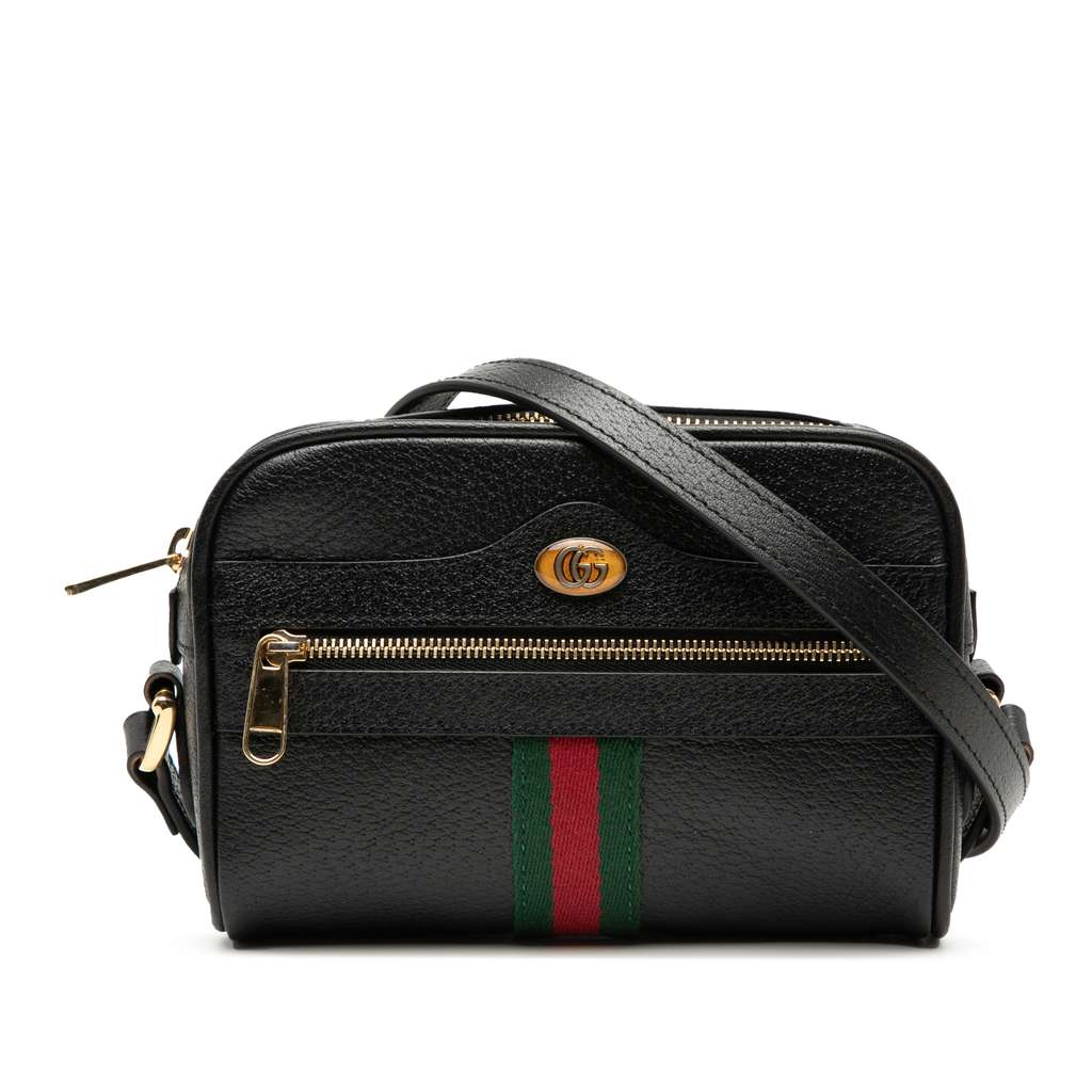 The Ophidia crossbody bag features a leather body, an adjustable flat leather shoulder strap, a top zip closure, an exterior zip pocket, and an interior slip pocket.