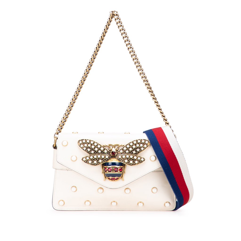 This satchel features a leather body with faux pearl and bee embellishments, a chain strap, a detachable fabric strap, a front leather flap with magnetic snap closure, and an interior slip pocket.