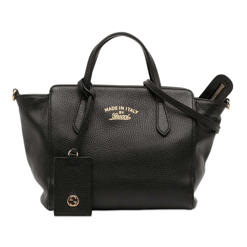The Mini Swing satchel features a leather body, flat leather handles, a detachable and adjustable flat leather strap, a top zip closure, and interior zip and slip pockets.