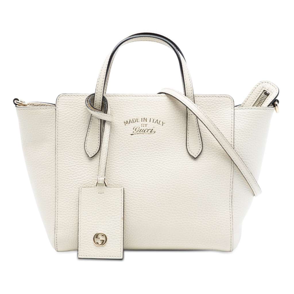 The Mini Swing satchel features a leather body, flat leather handles, a detachable flat leather strap, a top zip closure, and interior zip and slip pockets.