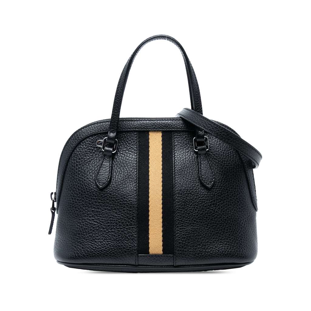 This satchel features a leather body with web details, flat leather handles, a detachable flat leather strap, a top zip closure, and an interior slip pocket.