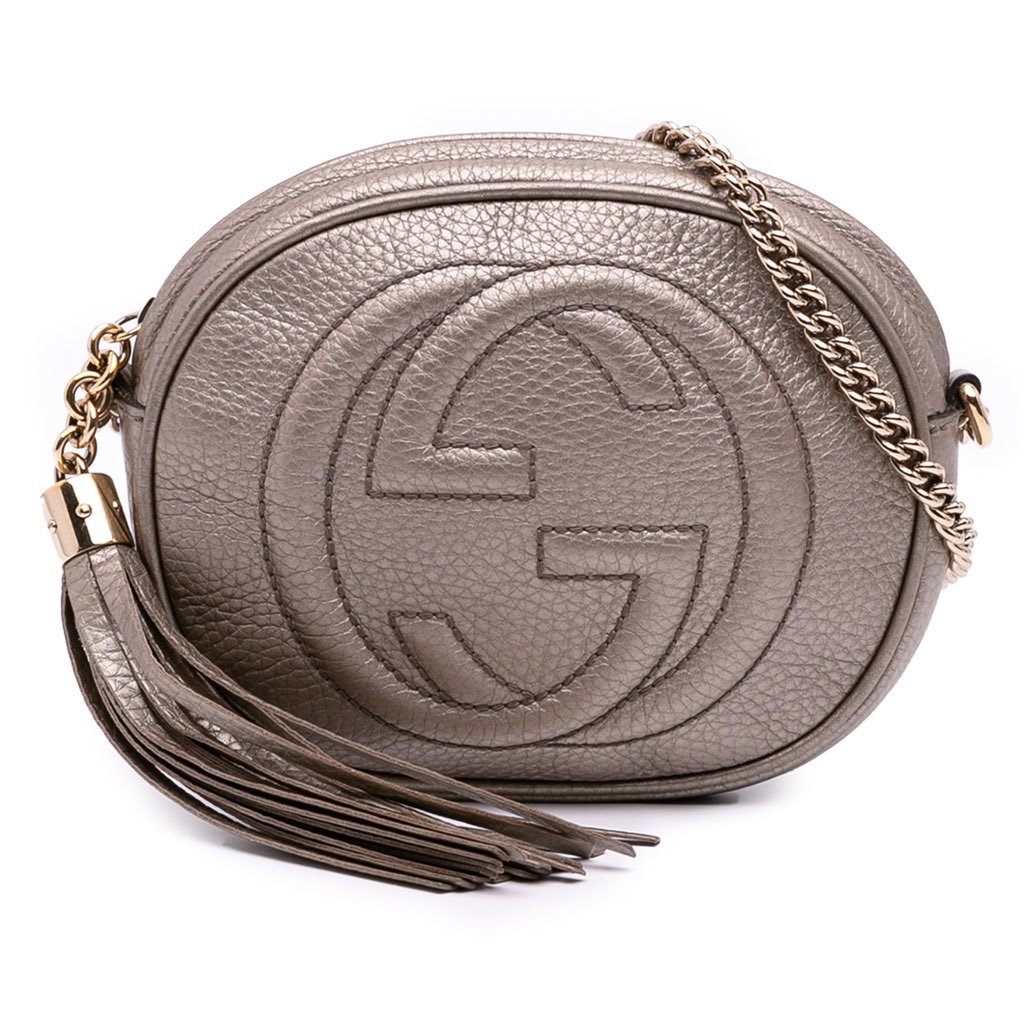 The Soho Crossbody bag features a metallic leather body, a tassel detail, a chain link strap, a top zip closure, and an interior slip pocket.