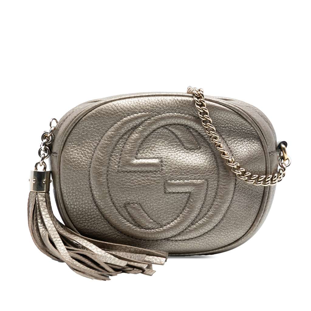 The Soho Crossbody bag features a metallic leather body, a chain link strap, a top zip closure with tassel zipper pull, and an interior slip pocket.