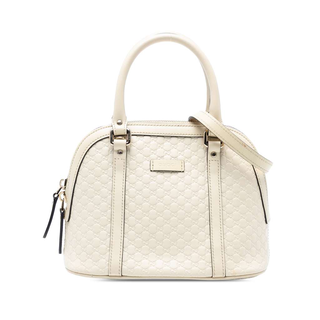 The Dome satchel features an embossed leather body, rolled leather handles, a detachable flat leather strap, a top zip closure, and an interior slip pocket.