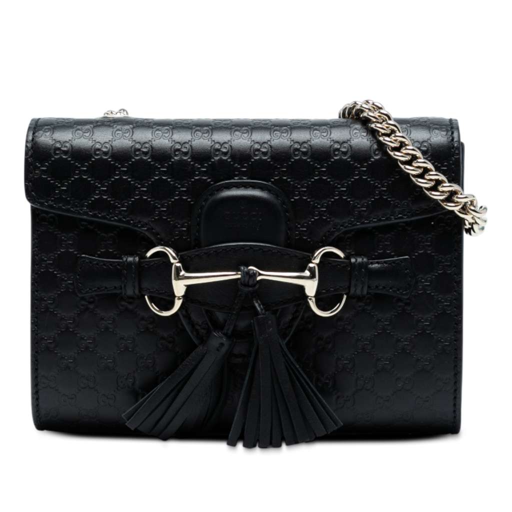 The Mini Emily features an embossed leather body, curb chain strap, a front flap with a slip through closure and a tassel detail, and an interior slip pocket.