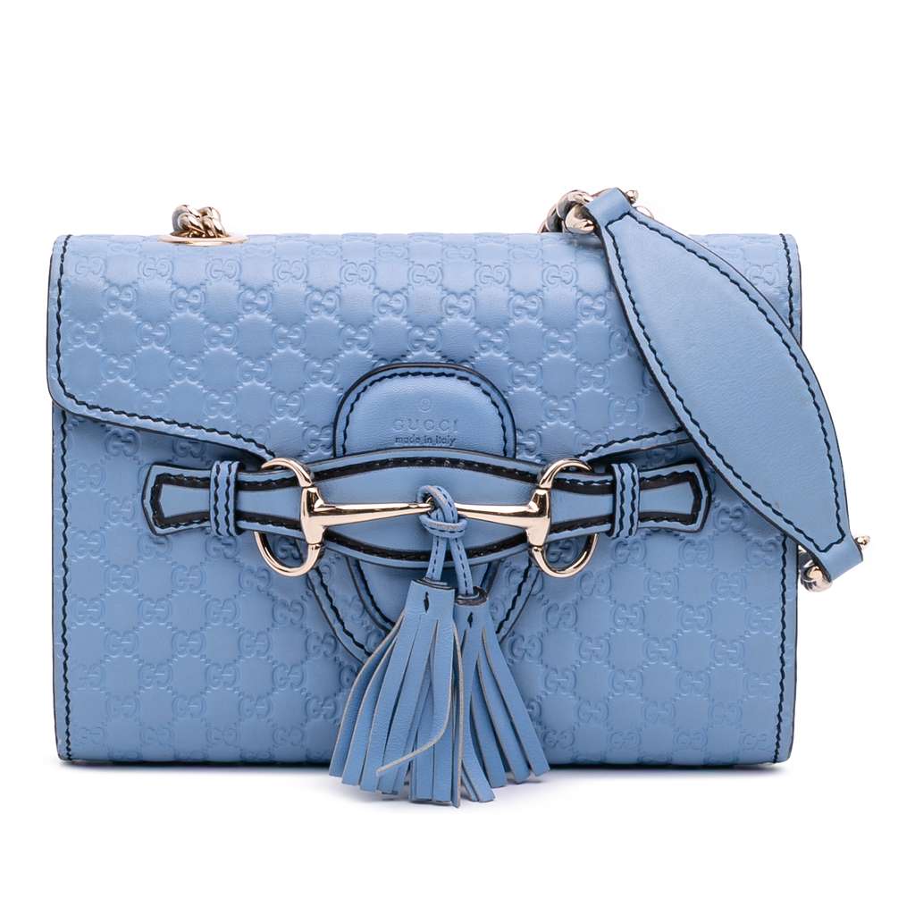 The Mini Emily features an embossed leather body, a chain link strap with leather guard, a front flap with a slip through closure and a tassel detail, and an interior slip pocket.