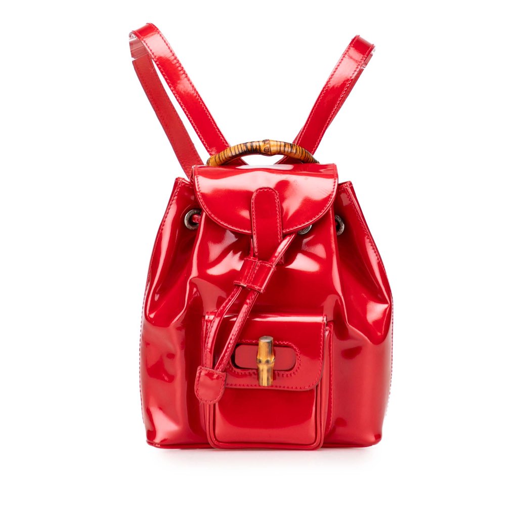 This backpack features a patent leather body, a bamboo top handle, flat back straps, a top flap closure, an open top with drawstring closure, an exterior front flap pocket with bamboo twist lock closure, and an interior slip pocket.