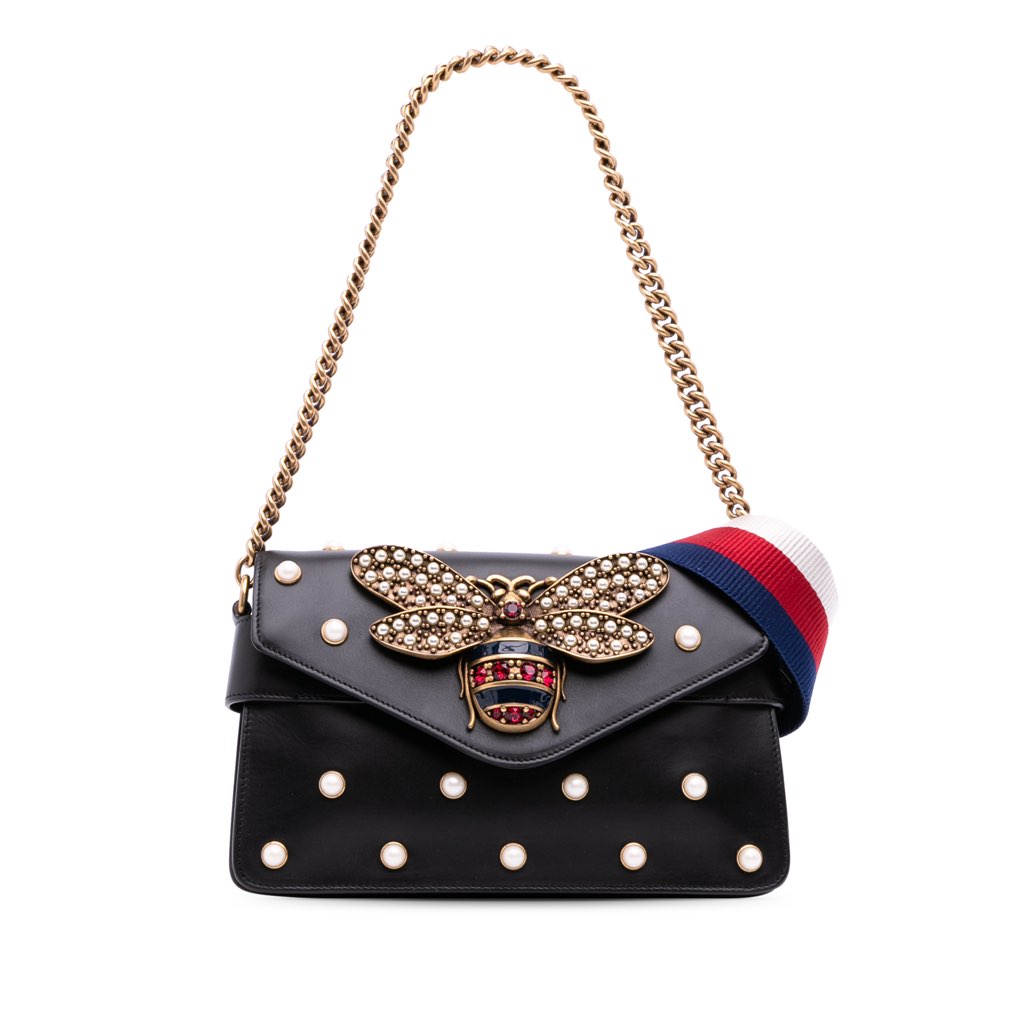 This satchel features a leather body with faux pearl and bee embellishments, a chain link strap, a detachable fabric strap, a front leather flap with magnetic snap closure, and an interior slip pocket.