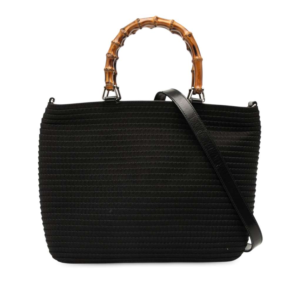 This satchel features a nylon body, bamboo top handles, a detachable flat leather strap, a top zip closure, and an interior zip pocket.