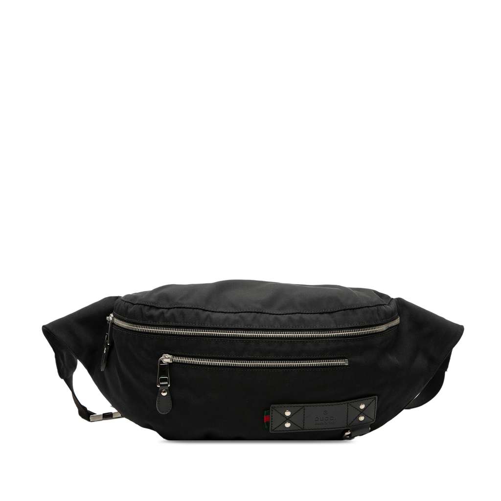 This belt bag features a nylon body, an adjustable flat strap, a top zip closure, and an exterior front zip pocket.
