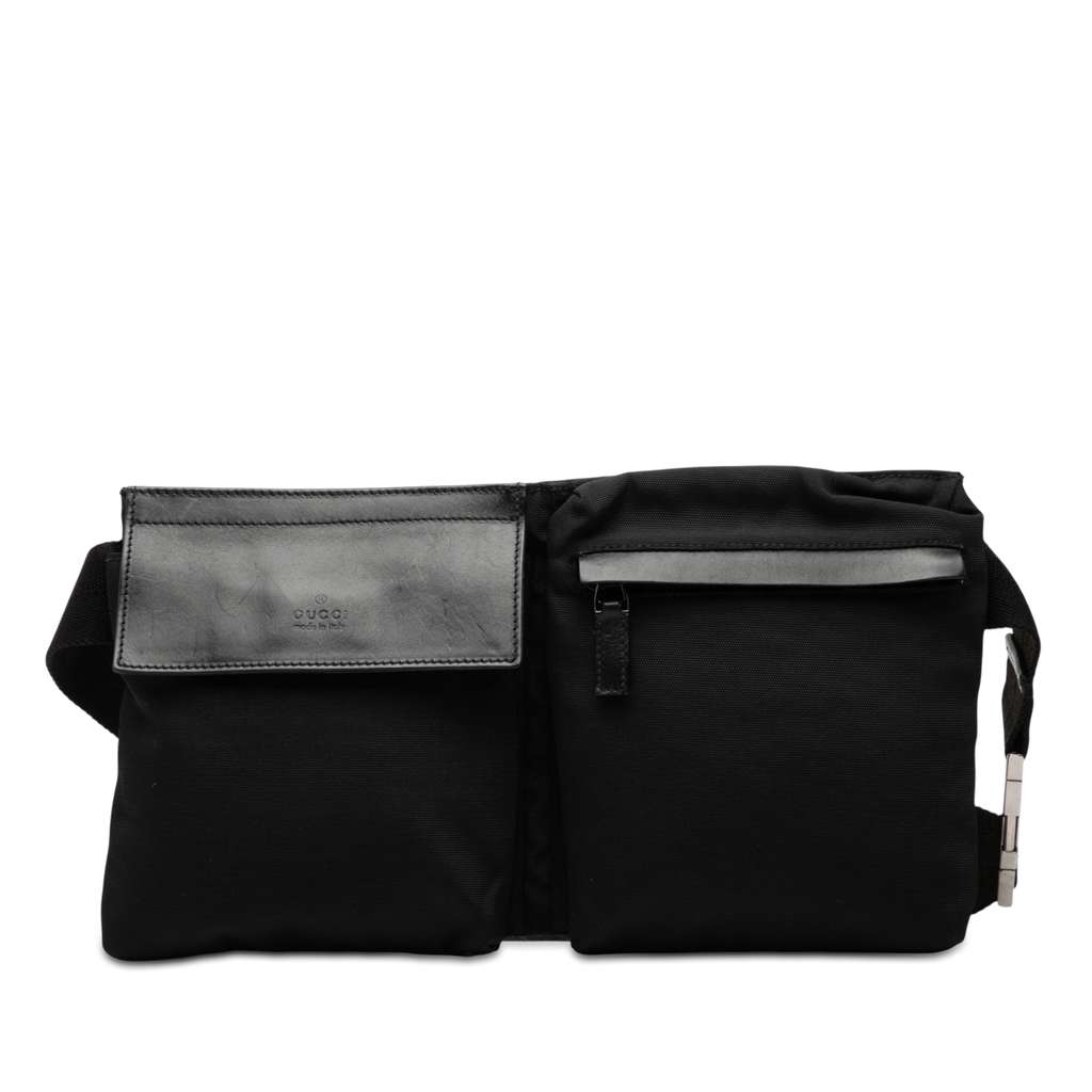 This belt bag features a nylon body with leather trim, an adjustable flat waist strap, exterior front flap and zip pockets, and an exterior back zip pocket.