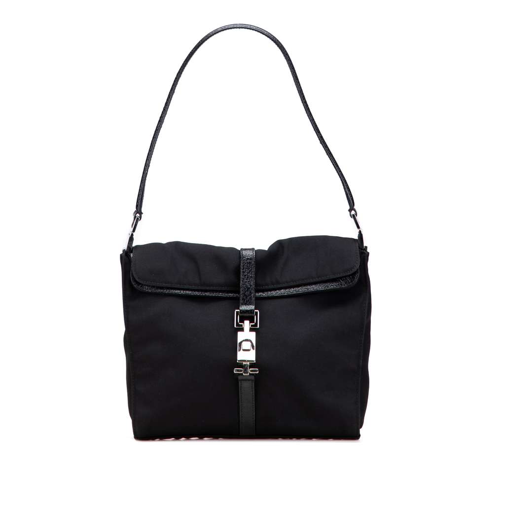 This Jackie shoulder bag features a nylon body, a flat leather strap, a fold over top with flat strap and push lock closure, and an interior zip pocket.