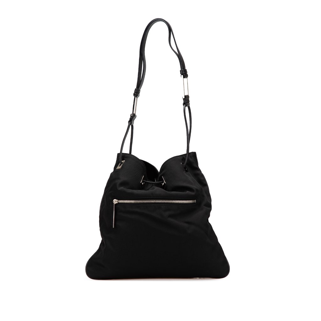 This shoulder bag features a nylon body with leather trim, a flat leather strap, an exterior zip pocket, a drawstring closure, and an interior zip pocket.
