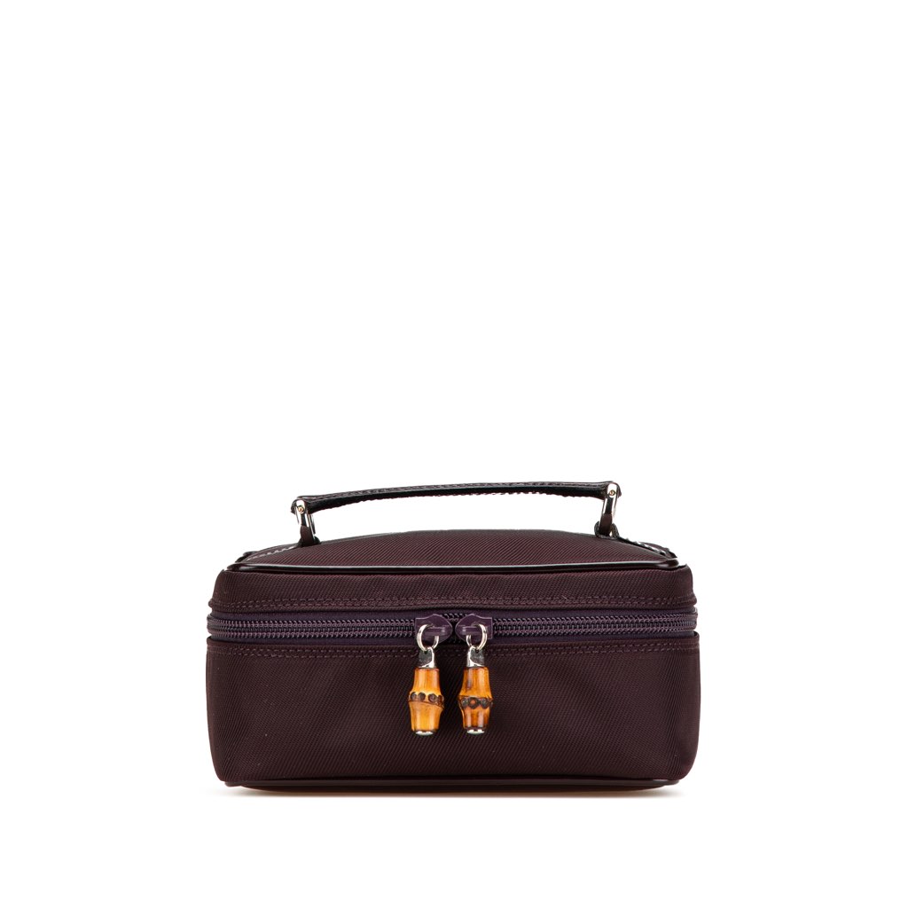 This vanity bag features a nylon body, a flat top handle, and a zip around closure.