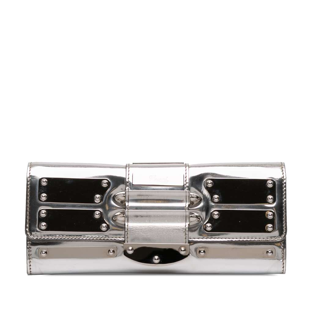 This clutch bag features a patent leather body, and a front flap with a snap closure.