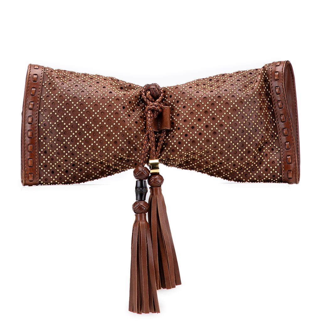 The Malika clutch features a perforated leather body with stud details, a front flap with a tassel embellished toggle closure, a top zip closure, and an interior slip pocket.