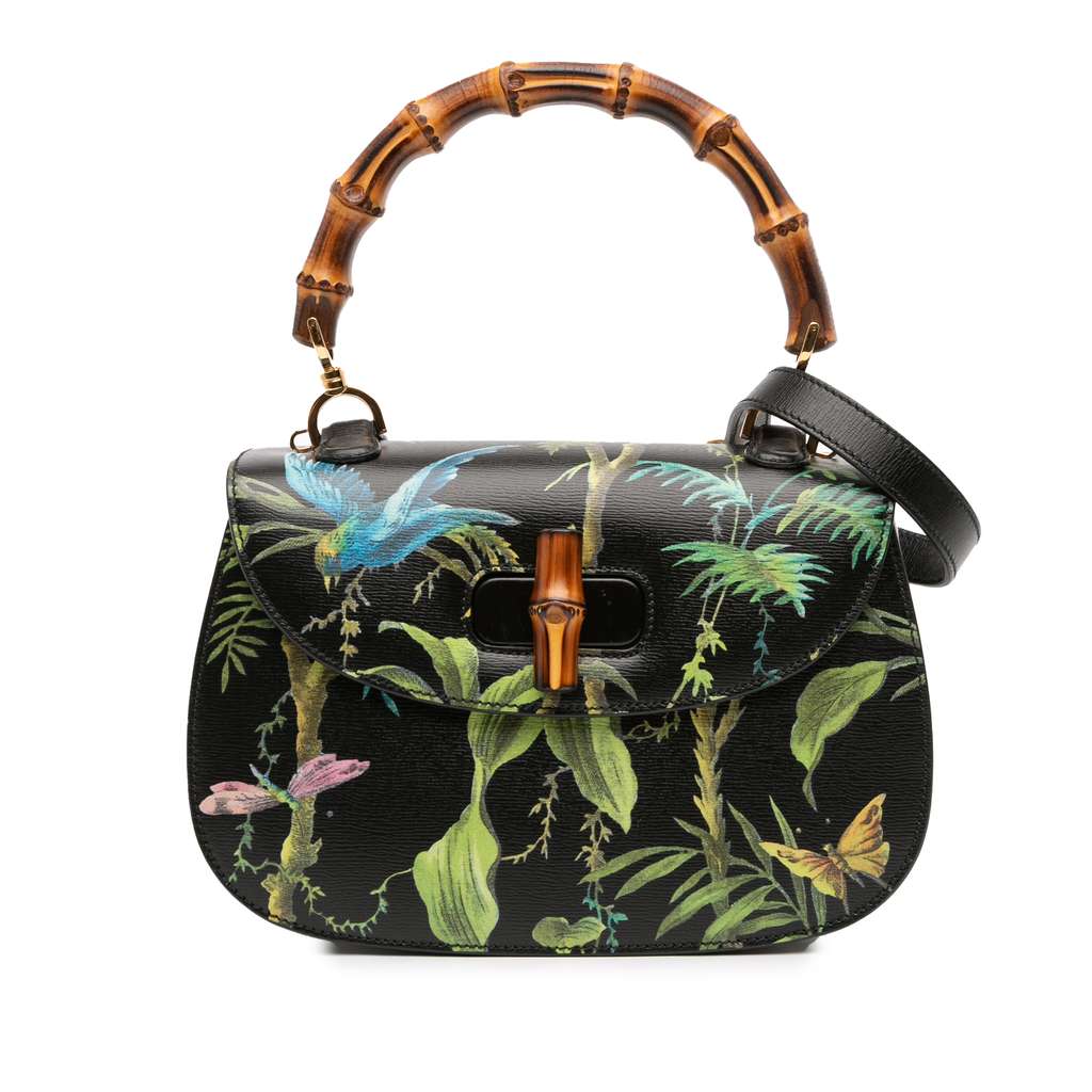 The Bamboo Night features a printed leather body, a bamboo top handle, a detachable flat strap, a flap with bamboo turn lock closure, and interior zip and slip pockets.
