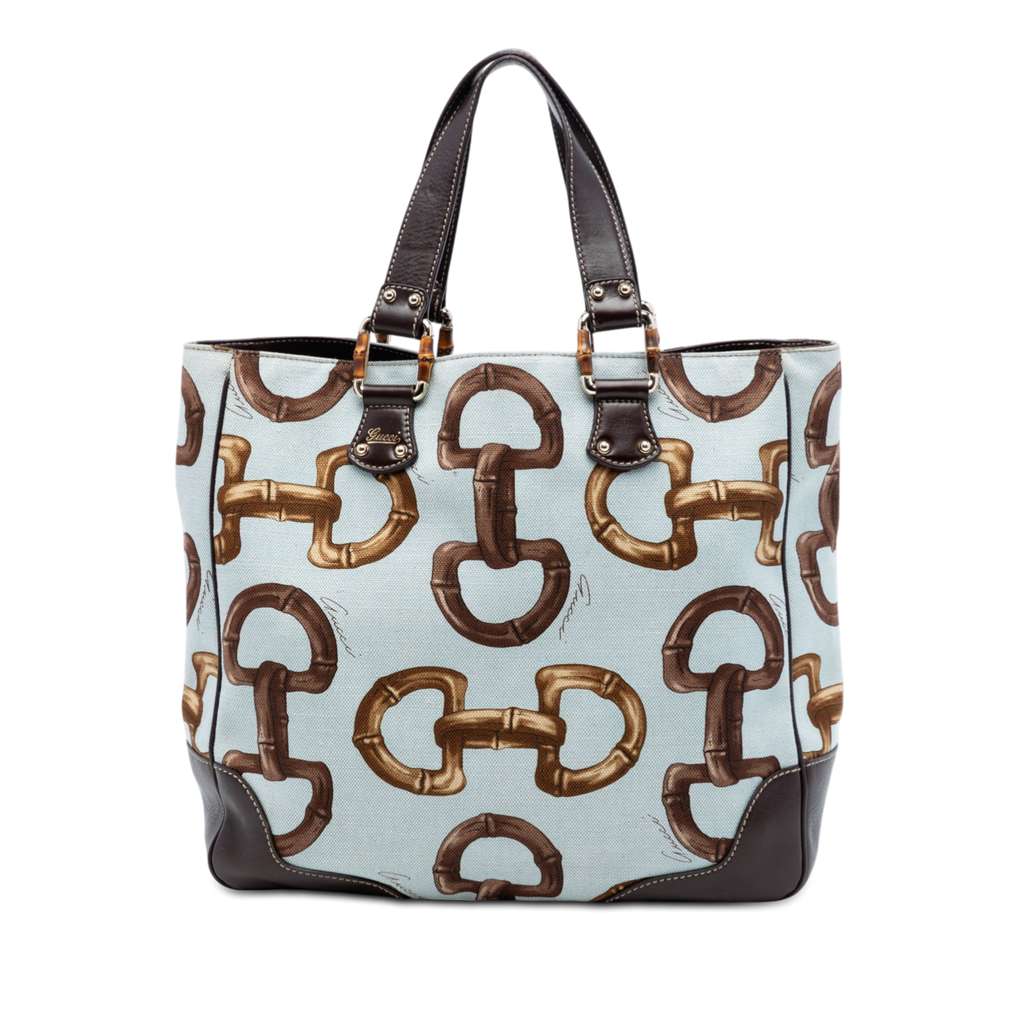 Gucci Printed Canvas Bamboo Horsebit Tote Blue Large Canvas