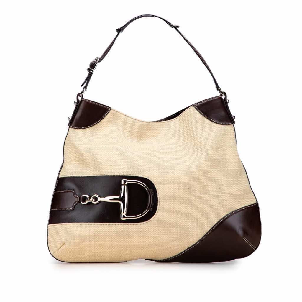 The Hasler features a raffia body with horsebit detail and leather trim, a flat leather strap, an open top with a magnetic closure, and an interior zip pocket.