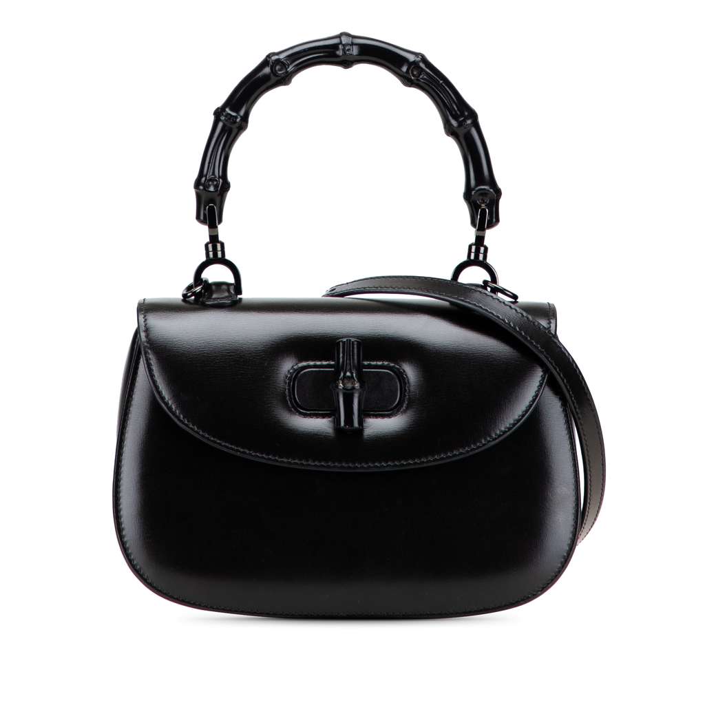 This satchel features a leather body, a bamboo top handle, a detachable flat leather shoulder strap, a front flap with a bamboo twist lock closure, and interior zip and slip pockets and a mirror inclusion.