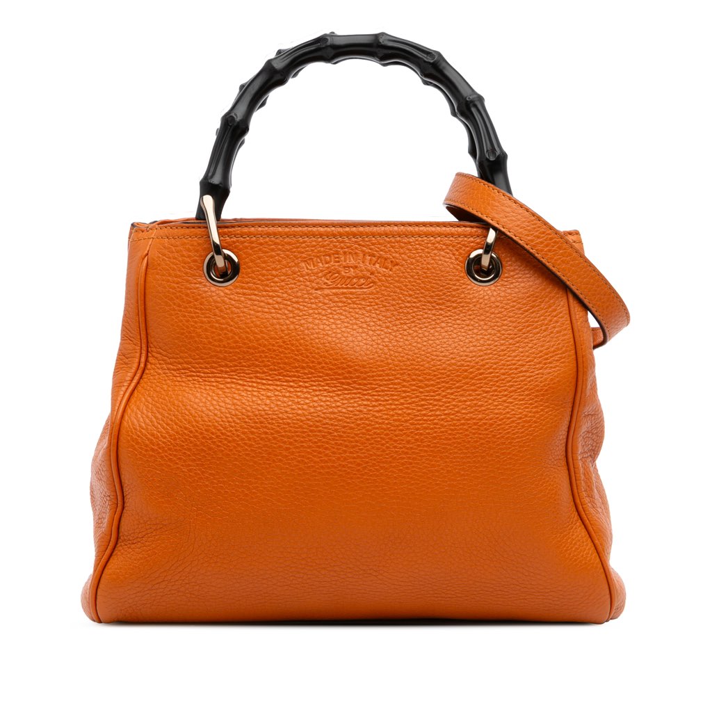 The Bamboo Shopper satchel features a leather body, bamboo handles, a detachable flat leather strap, an open top with magnetic snap closure, and interior zip and slip pockets.