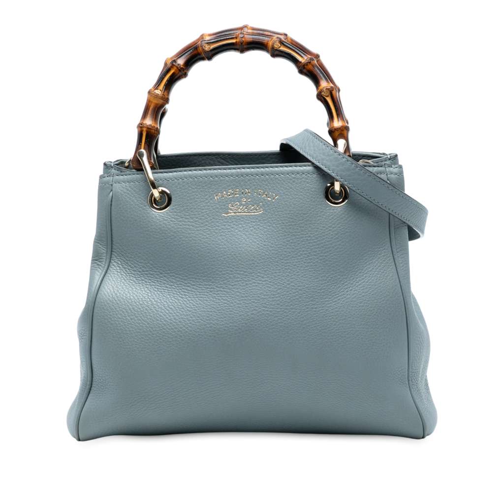 The Bamboo Shopper satchel features a leather body, bamboo top handles, a detachable strap, an open top with a magnetic closure, and interior zip and slip pockets.