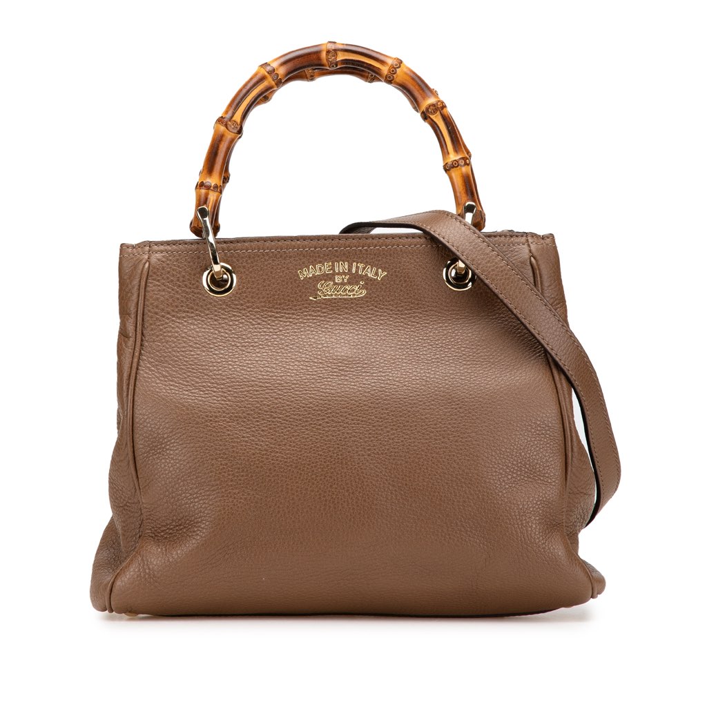 The Bamboo Shopper features a leather body, bamboo top handles, a detachable and adjustable flat leather shoulder strap, an open top with magnetic snap closure, and interior zip and slip pockets.