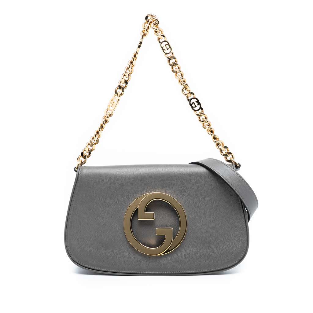 The Blondie bag features a leather body, a chain link strap, an adjustable and detachable flat leather strap, a front flap with magnetic snap closure, and an interior zip pocket.