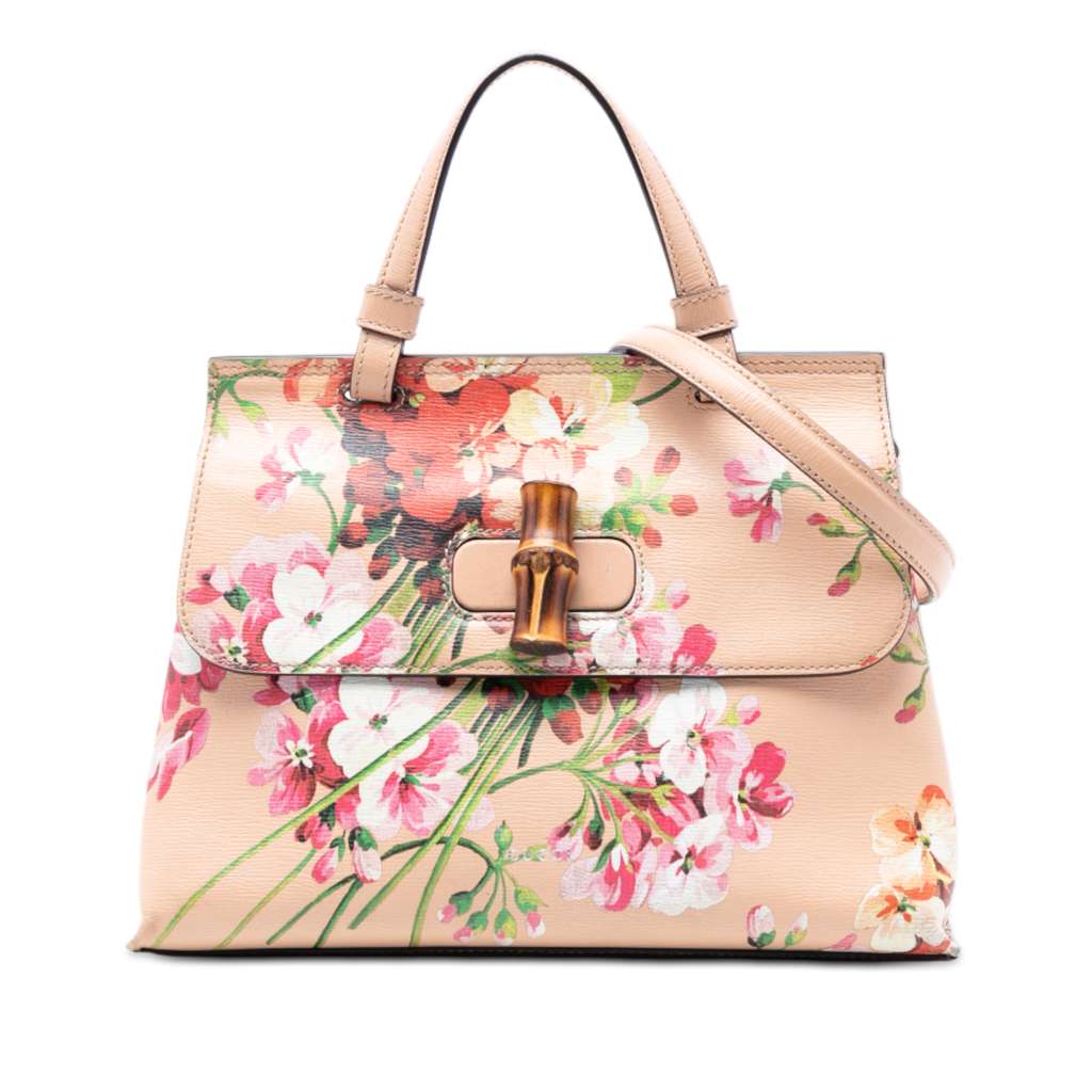 The Daily satchel features a printed leather body, a flat leather top handle, a detachable flat leather strap, a front flap with a bamboo bullet twist lock closure, and interior zip and slip pockets.