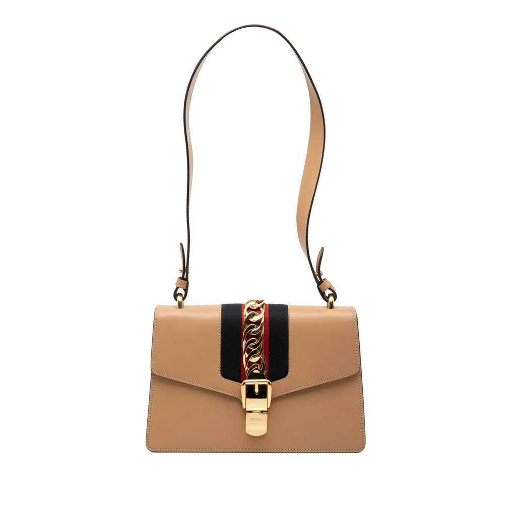 The Sylvie features a leather body with web detail, a flat leather top handle, a detachable flat leather shoulder strap, a detachable web shoulder strap, a front flap with push lock closure, and interior zip and slip pockets.