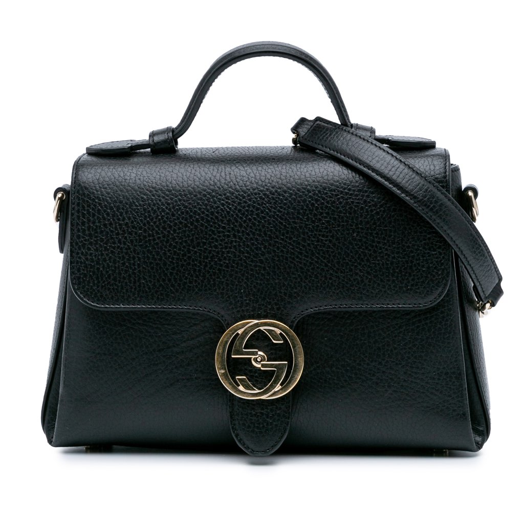 This satchel features a leather body, a flat leather top handle, a detachable chain-link shoulder strap, a front flap with interlocking GG flip-lock closure, and interior zip and slip pockets.