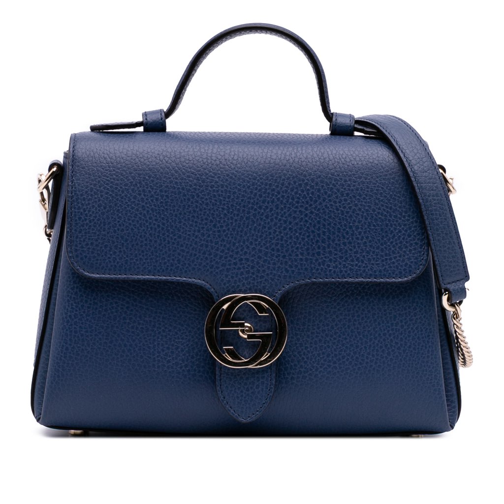 This satchel features a leather body, a flat leather top handle, a detachable chain-link shoulder strap with leather guard, a front flap with interlocking GG flip-lock closure, and interior zip and slip pockets.