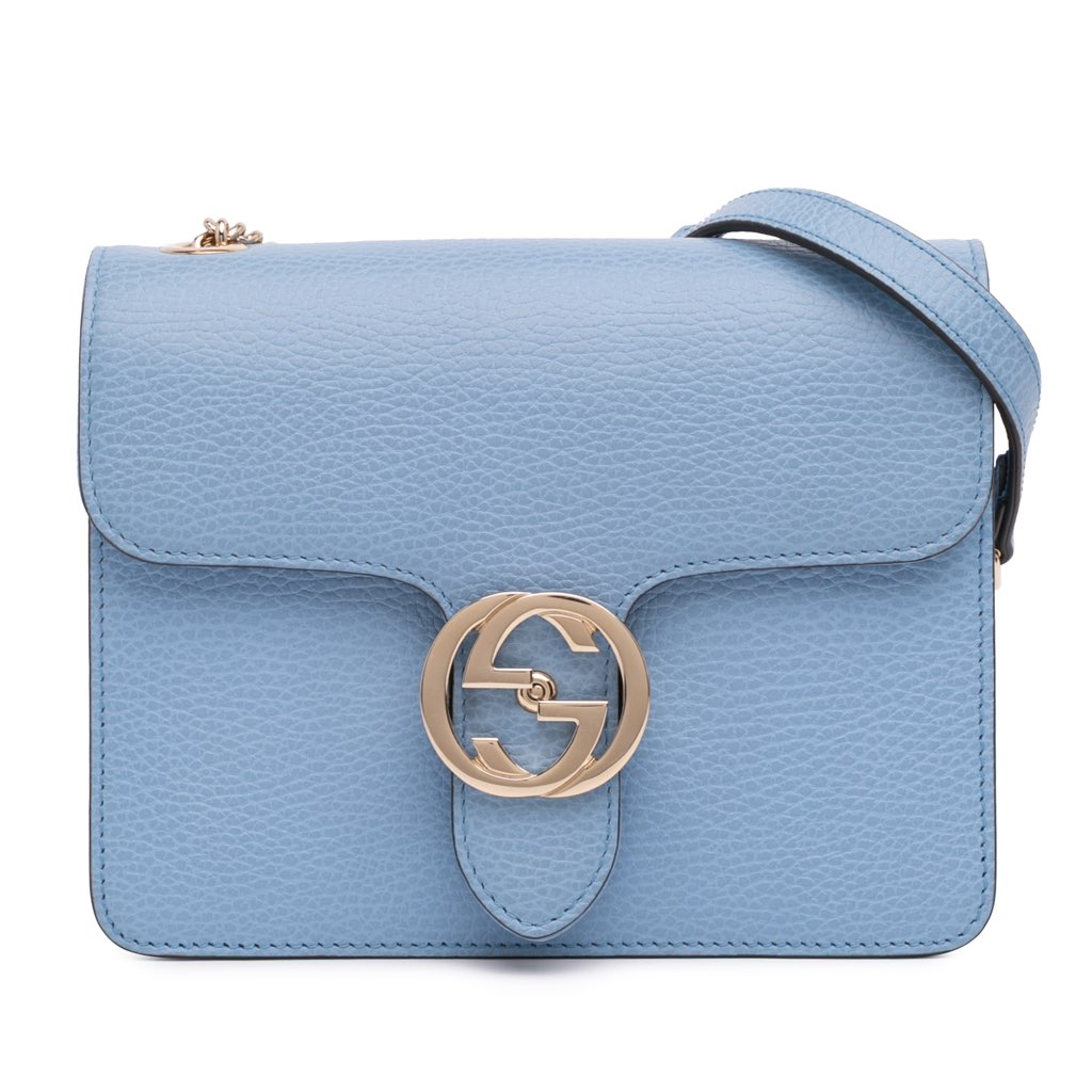 This crossbody bag features a leather body, a chain-link shoulder strap with leather shoulder guard, a front flap with interlocking GG flip-lock closure, interior compartments, and an interior slip pocket.