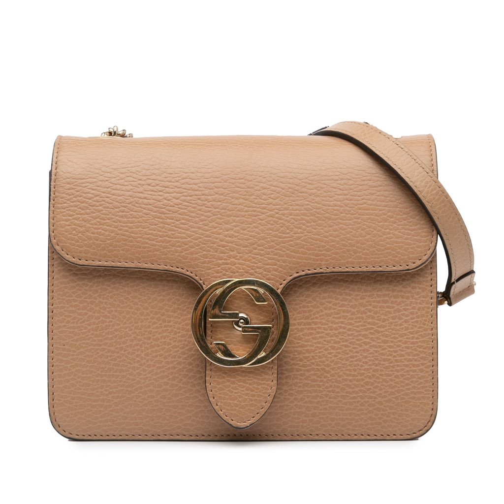 The Dollar Interlocking G crossbody bag features a leather body, a chain-link shoulder strap with leather guard, a front flap with snap button closure, and an interior slip pocket.