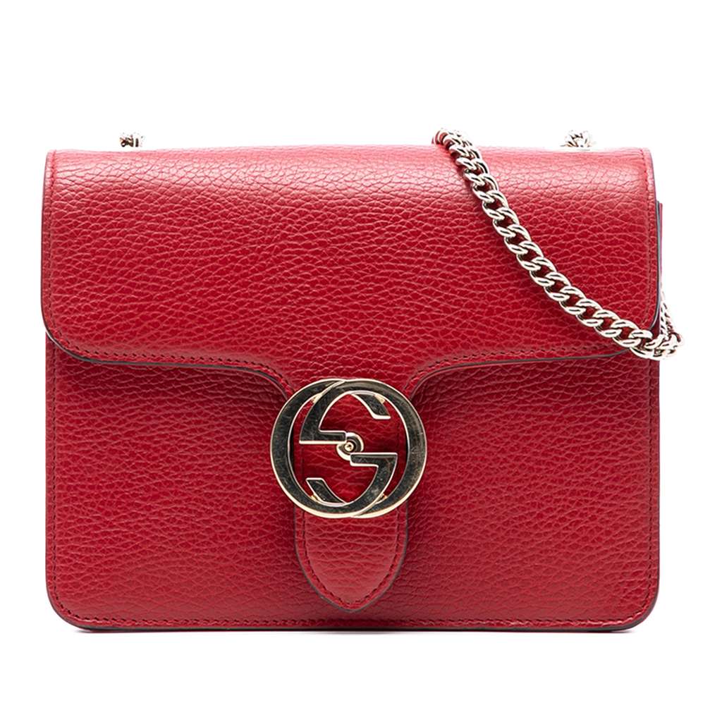 This crossbody bag features a leather body, a chain-link shoulder strap with leather shoulder guard, a front flap with snap button closure, and an interior slip pocket.