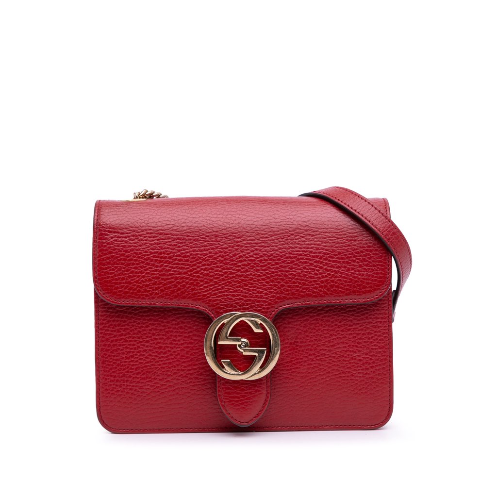 This crossbody bag features a leather body, a chain-link shoulder strap with leather shoulder guard, a front flap with snap button closure, and an interior slip pocket.