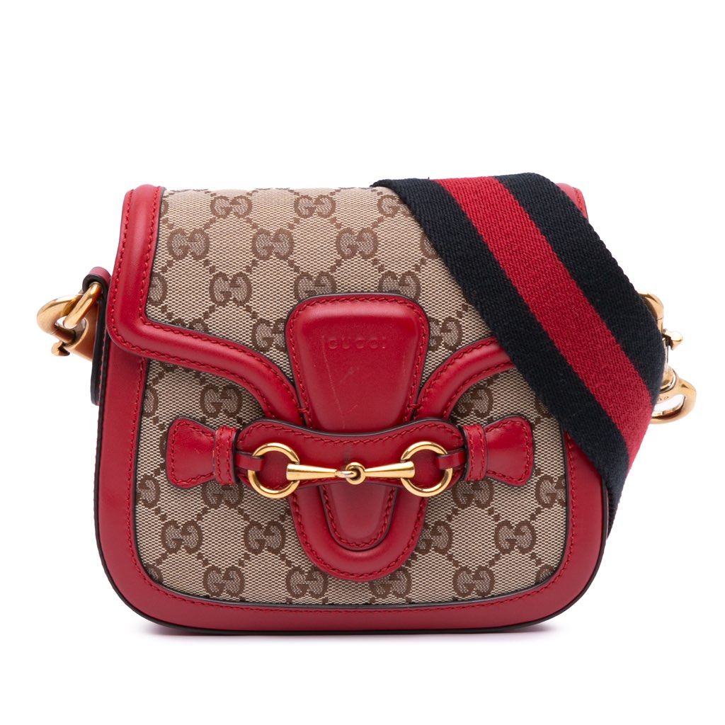 The Lady Web Crossbody features a canvas body with leather trim, an adjustable and detachable flat shoulder strap, a front flap with slip-through closure, and an interior slip pocket.