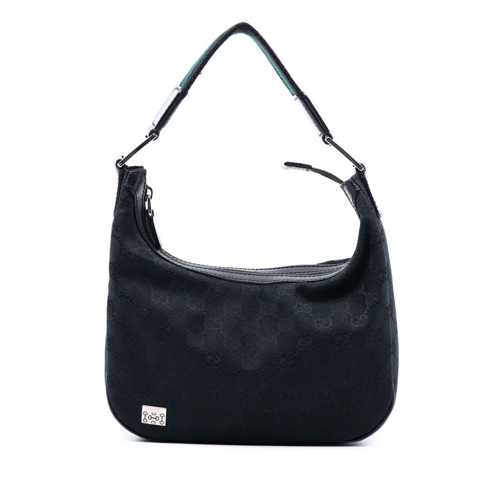 This handbag features a canvas body with leather trim, a flat canvas web handle, a top zip closure, and interior zip and slip pockets.