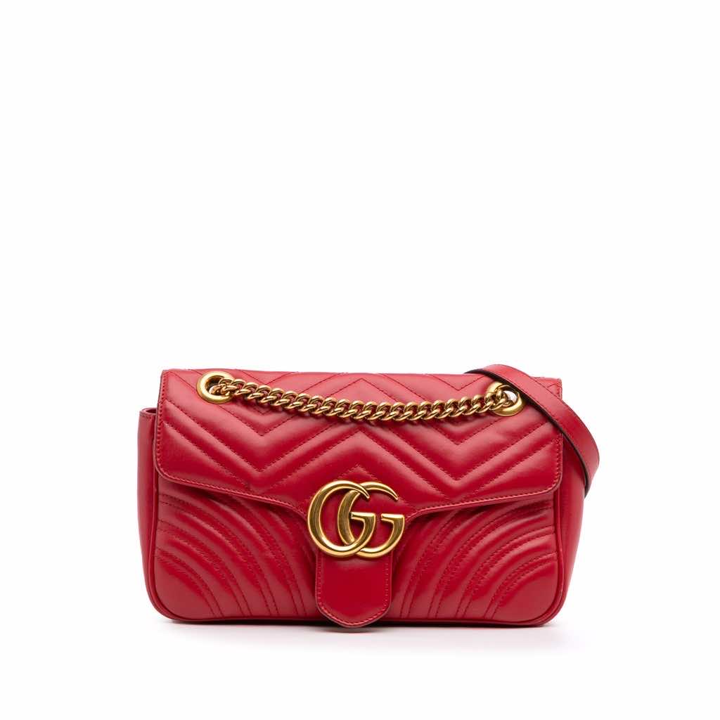 This crossbody bag features a quilted leather body, a chain link strap with leather guard, a front flap with push lock closure, and an interior zip pocket.