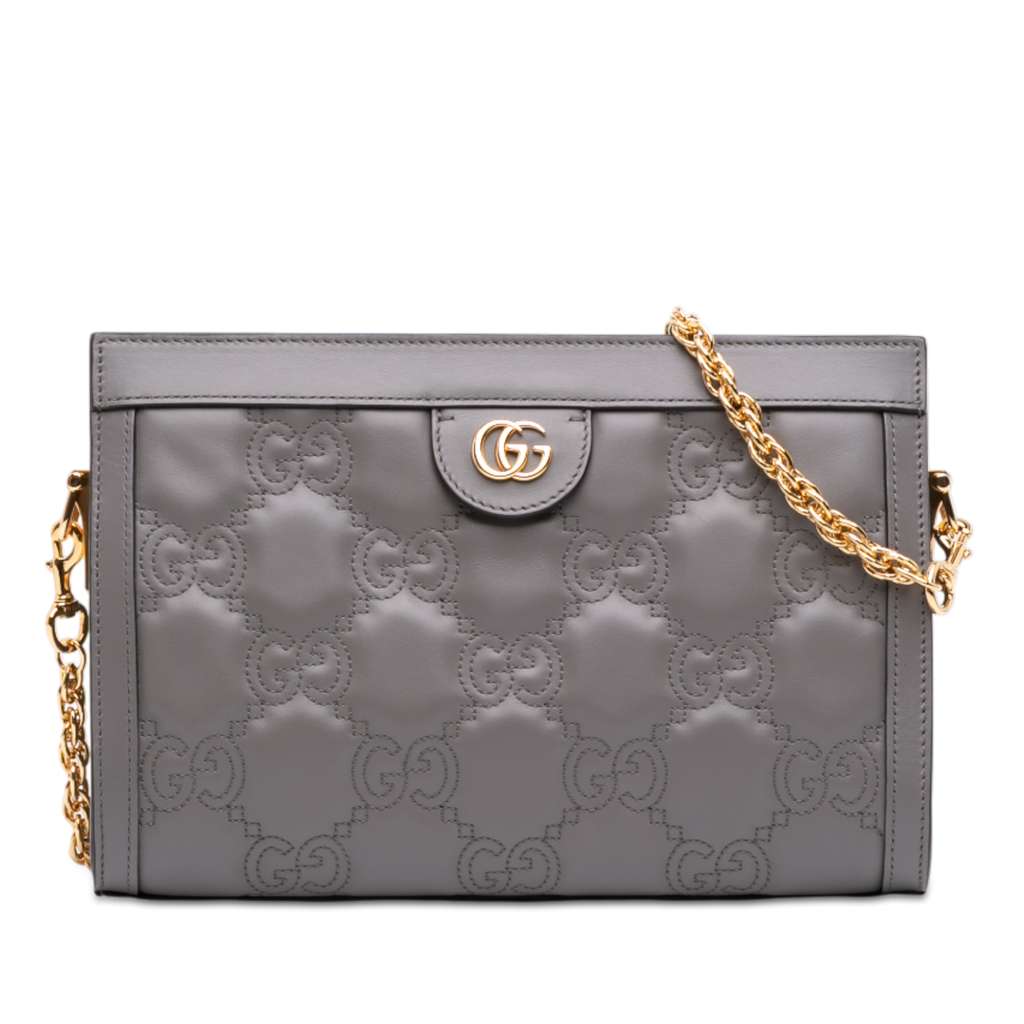 The Ophidia shoulder bag features a leather body, a gold-tone chain link strap, a detachable flat canvas strap, a magnetic snap button closure, and an interior slip pocket.