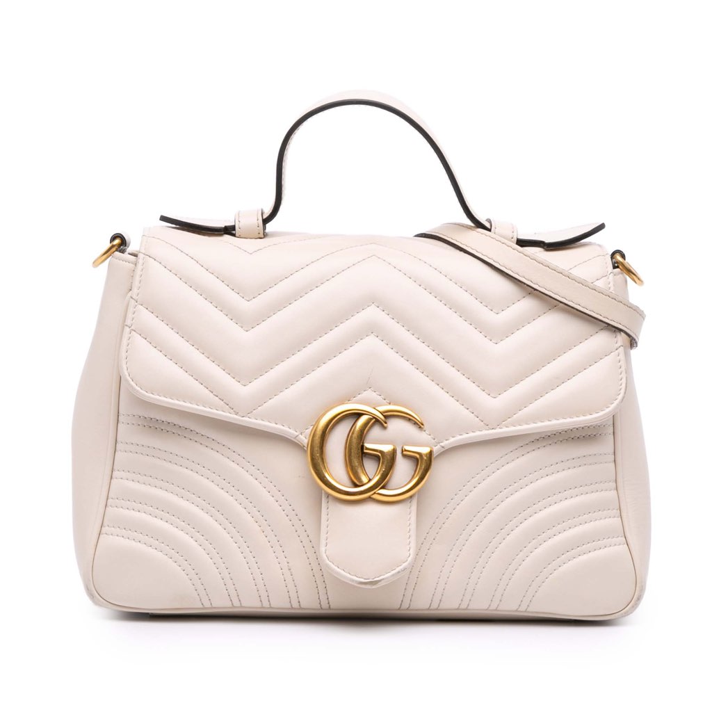 The Marmont Satchel features a quilted leather body, a flat leather top handle, a chain link shoulder strap with leather guard, a front flap with a magnetic snap button closure, and interior zip and slip pockets.