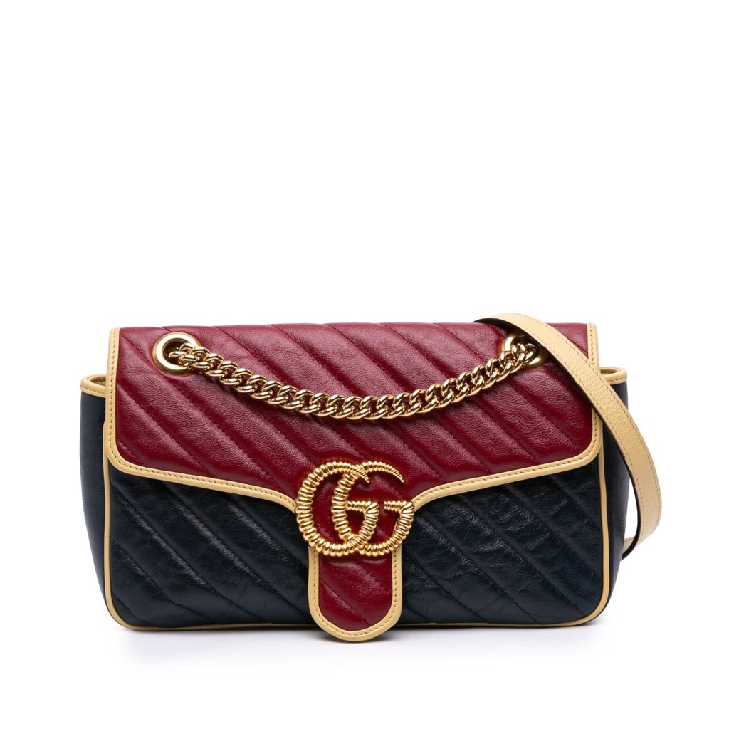 This crossbody bag features a leather body, a chain link shoulder strap with leather guard, a front flap with push lock closure, and an interior zip pocket.