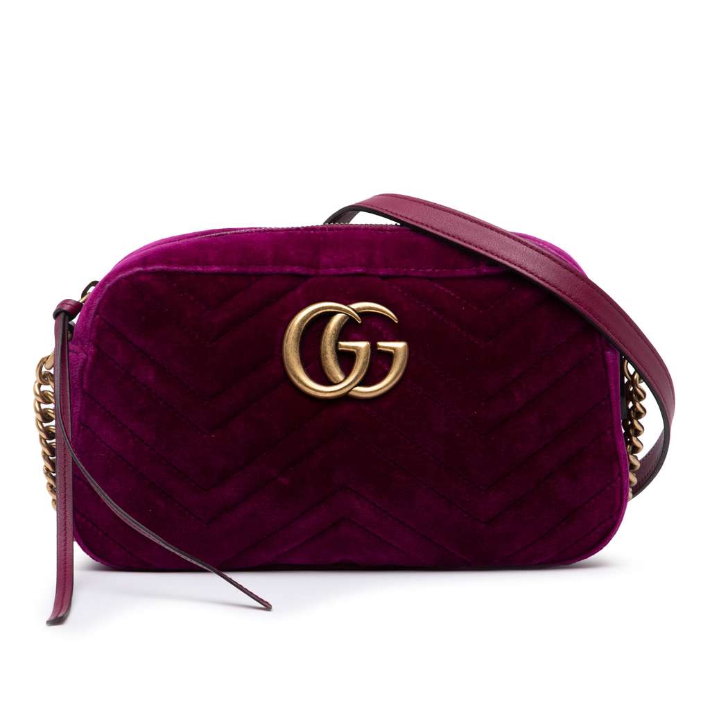 This crossbody bag features a quilted velvet body, a gold-tone chain link strap with leather guard, a top zip closure, and an interior slip pocket.