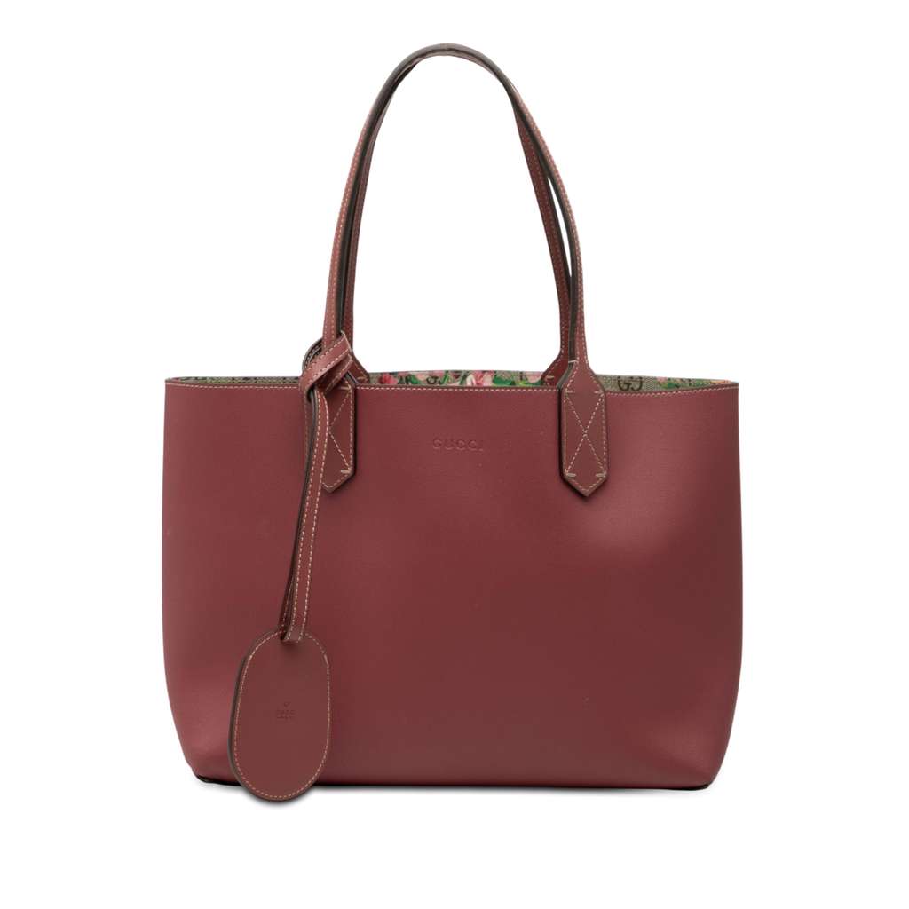 This tote bag features a coated canvas body with leather trim, flat leather handles, and an open top.