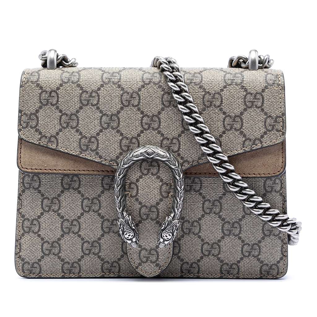 The Dionysus Crossbody bag features a coated canvas body with suede leather trim, a chain link shoulder strap, a top flap with magnetic snap closure, and an interior zip compartment.