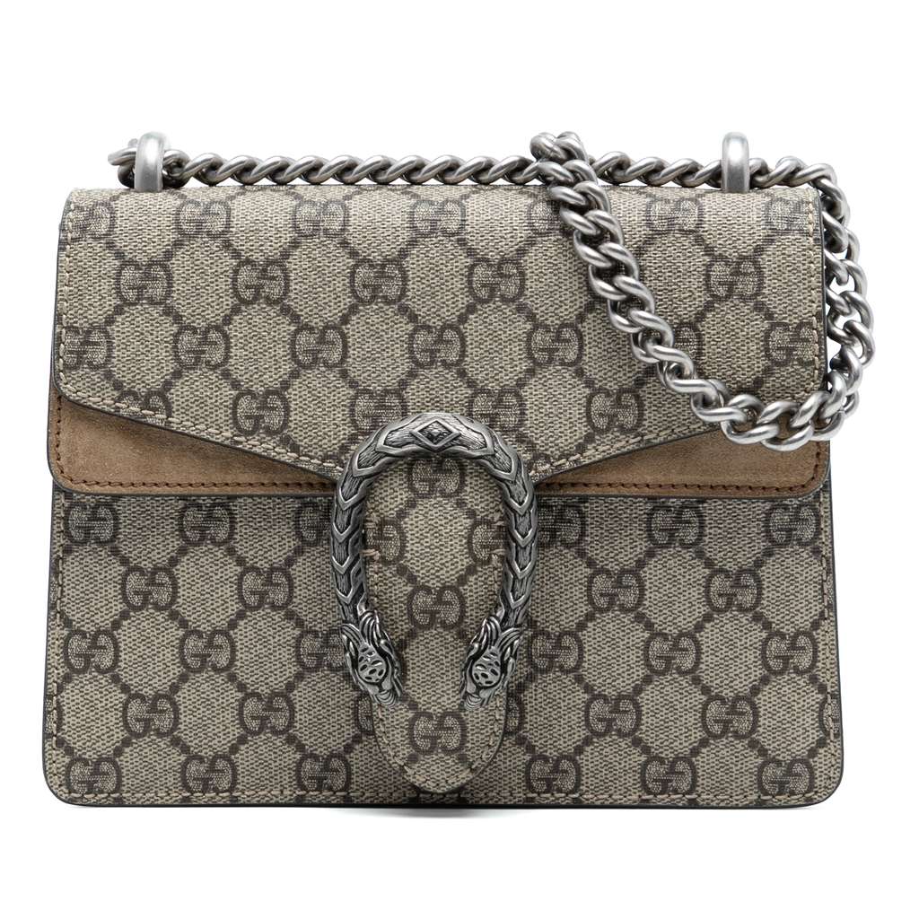 The Dionysus Crossbody bag features a coated canvas body with suede leather trim, a silver-tone chain strap, and a top flap with a magnetic snap button closure.