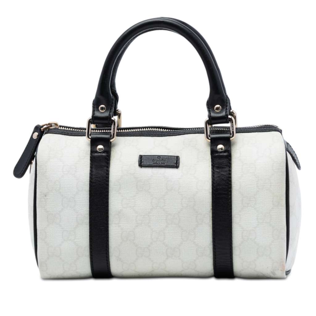 This boston bag features a coated canvas body with leather trim, rolled leather handles, a top zip closure, and an interior slip pocket.