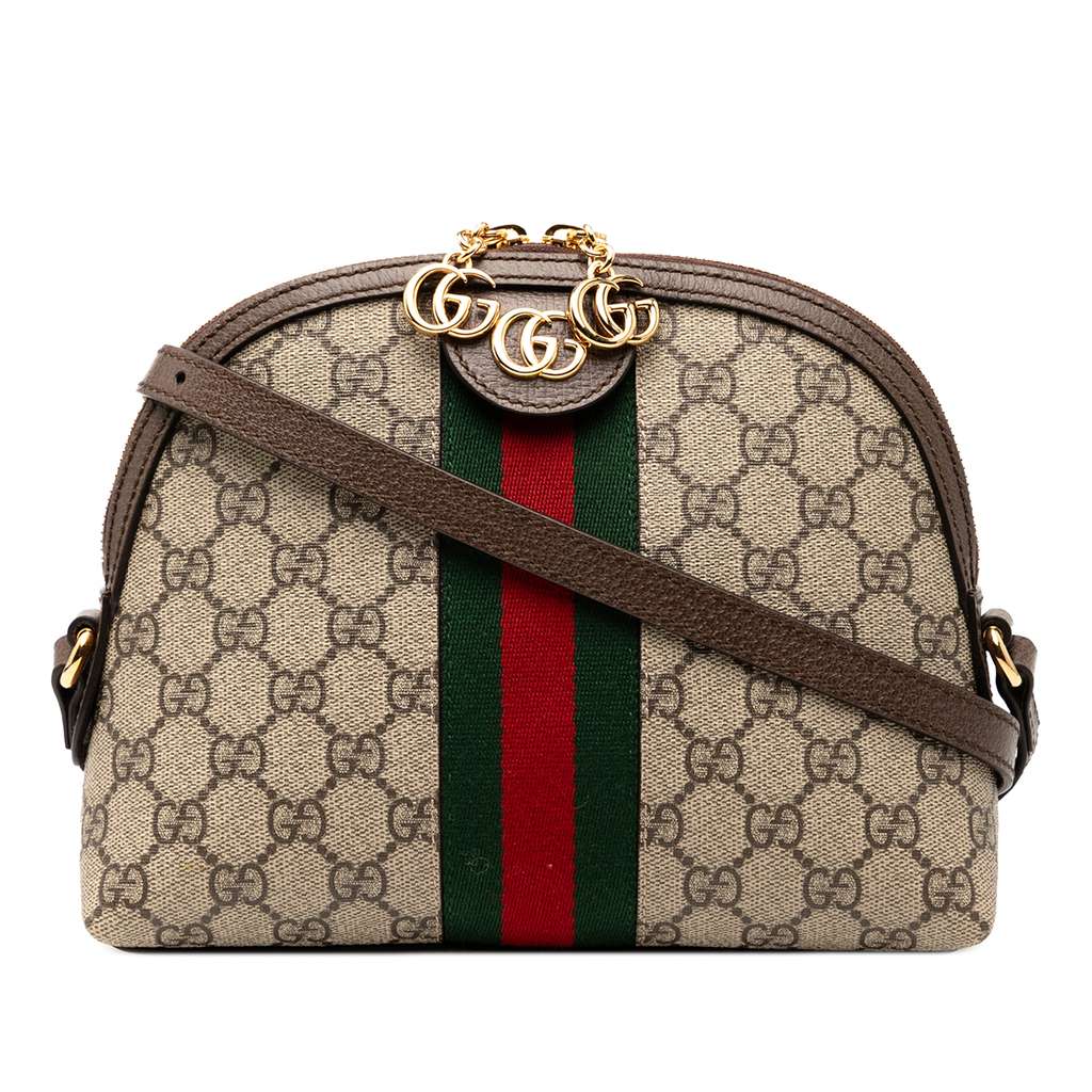 The Ophidia crossbody bag features a coated canvas body with leather trim and front web detail, a flat leather strap, a top zip closure, and interior slip pockets.